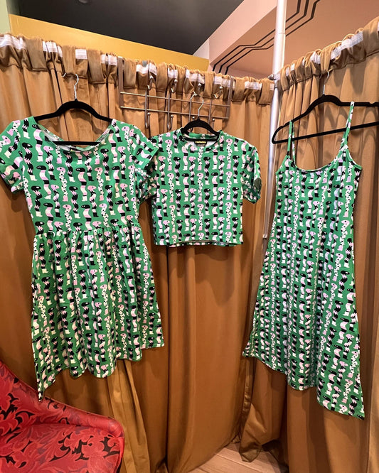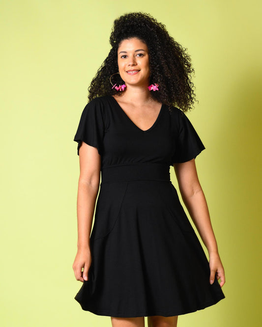 Squasht Drea Draped Dress in Black with Sage & Gold Vintage Trim