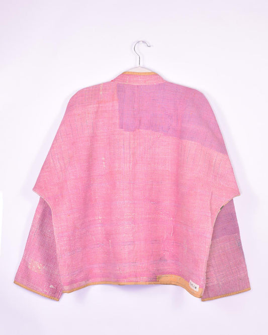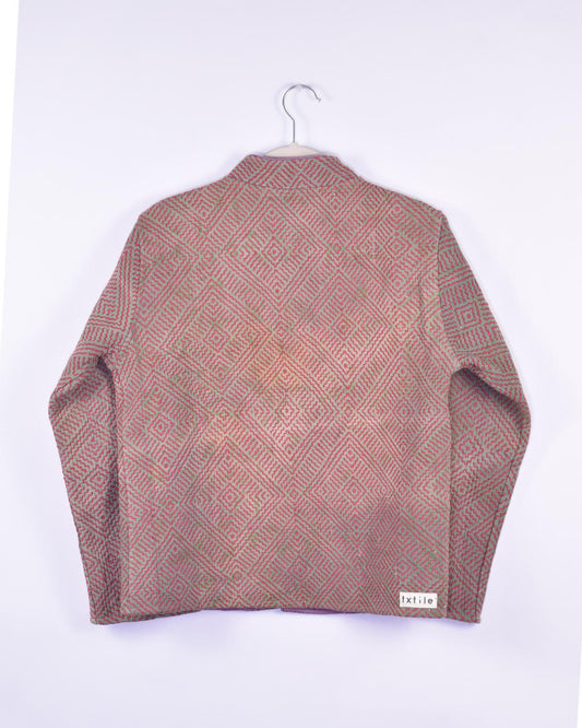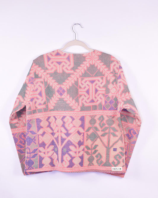Txtile Billie Quilted Reversible Patchwork Kantha Jacket - Size Large - Allover Intricate Crosshatch Embroidery in Pink & Green