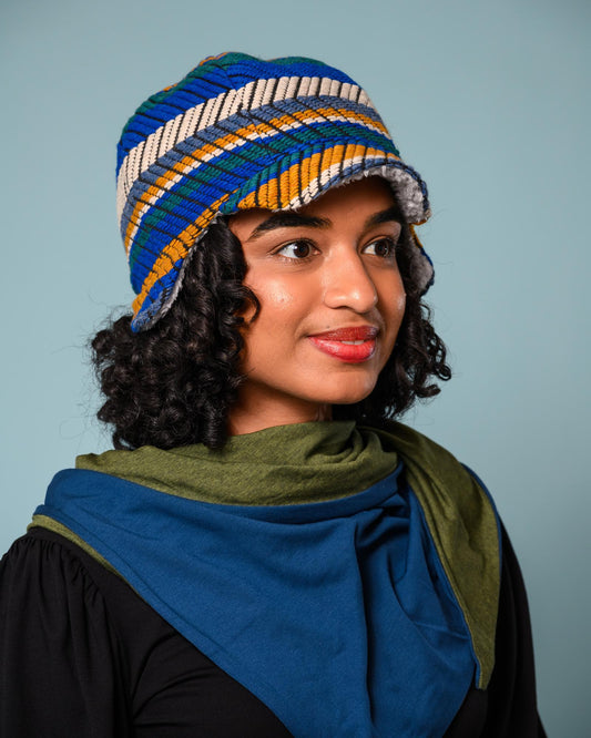 Squasht Darby Earflap Hat in Textured Blue & Gold & White Stripes