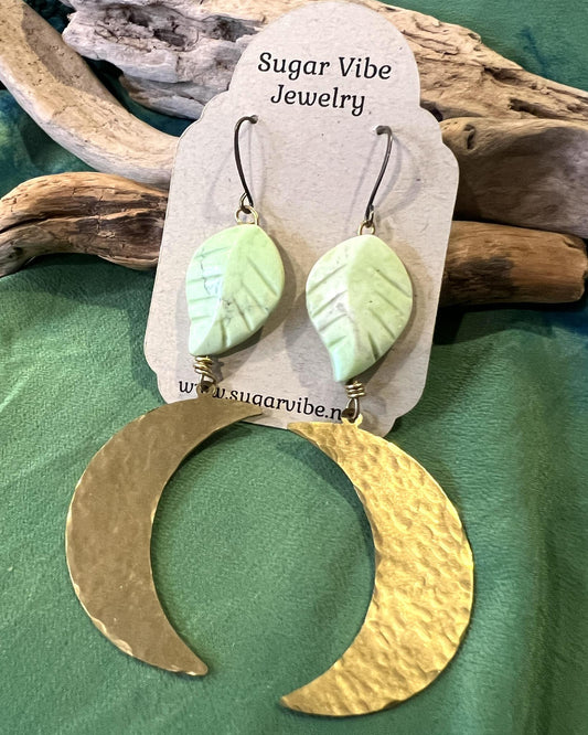 Sugar Vibe Crescent Moon Earrings with Green Leaves