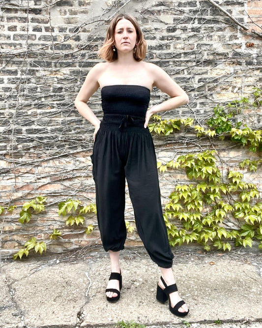 Squasht Wide Leg Long Length Pants in Solid Black with Rope Texture