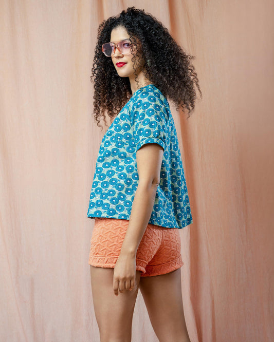 Squasht Puff Sleeve Top in Caribbean Turquoise Cotton Poplin Flower Print 🌼 Size XS, Small