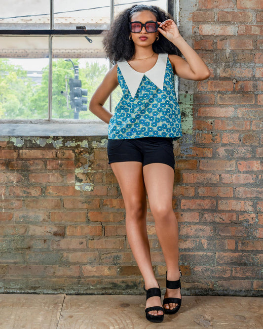 Squasht 70s Collared Tank in Turquoise Flower Print with White Grid Collar