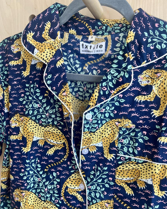 Txtile Button Up Shirt - Pajama Style - Fierce Leopard Print on Navy Background - SALE