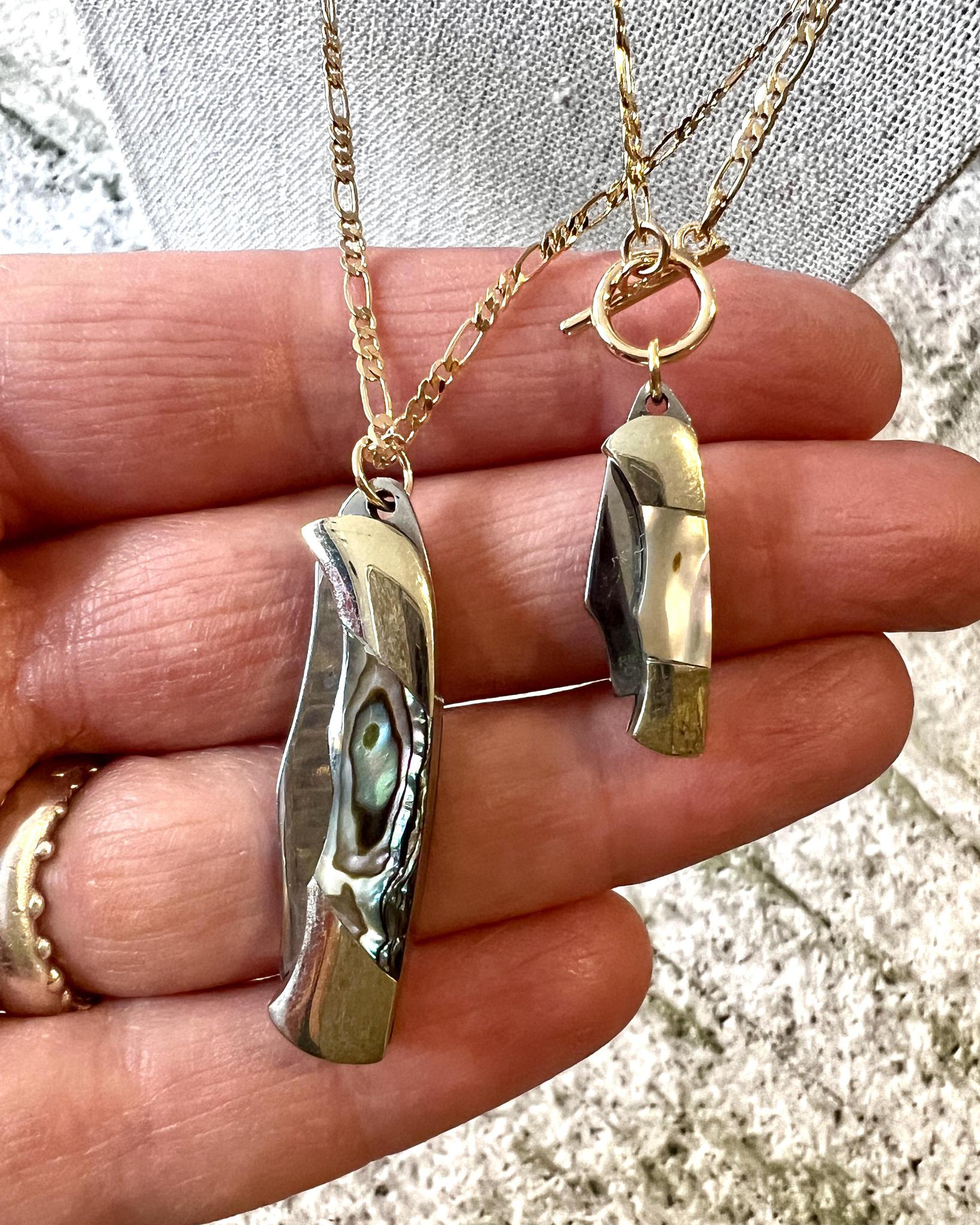 1979 Jewelry Knife Necklace 1.5 inch Multi Colored Abalone - 14kt GF chain