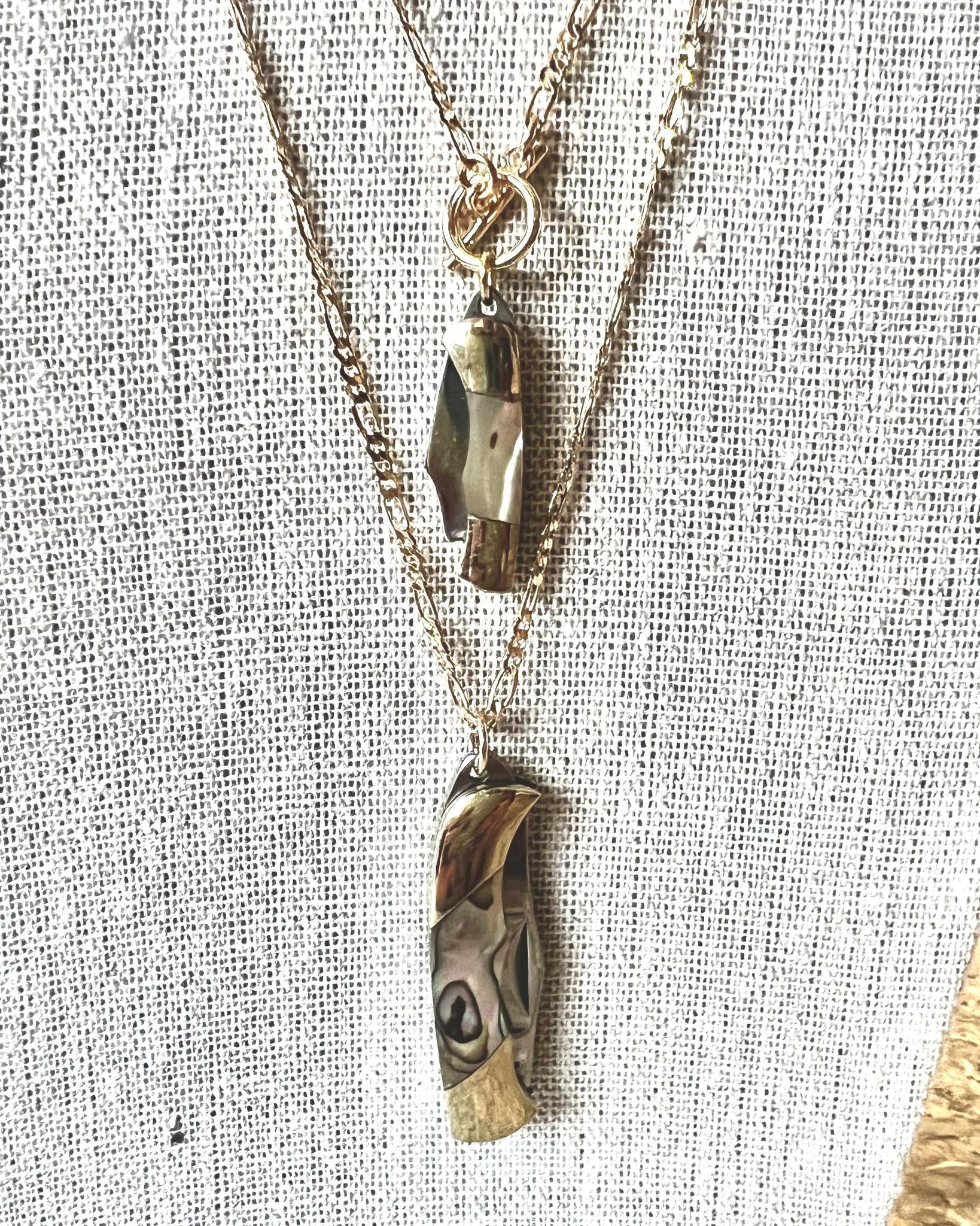 This necklace features a multi-colored abalone shell knife. Please note each abalone is unique so there will be variations in the color and swirls, etc. Also the chain style may differ.
