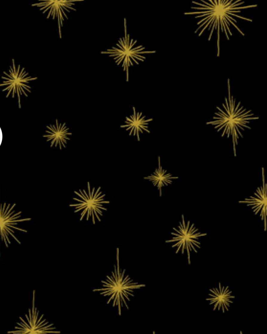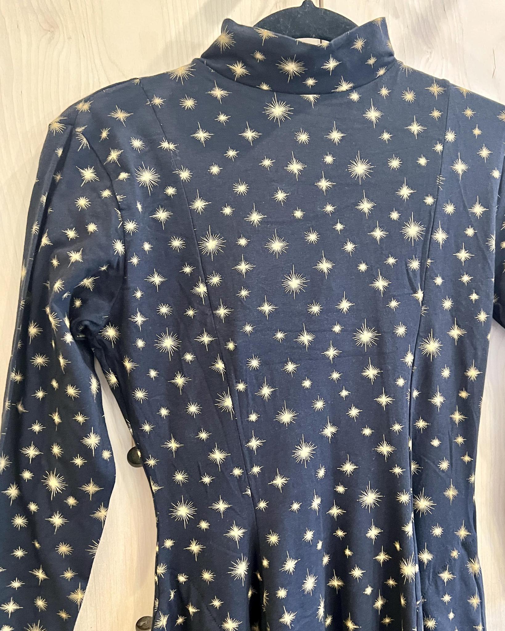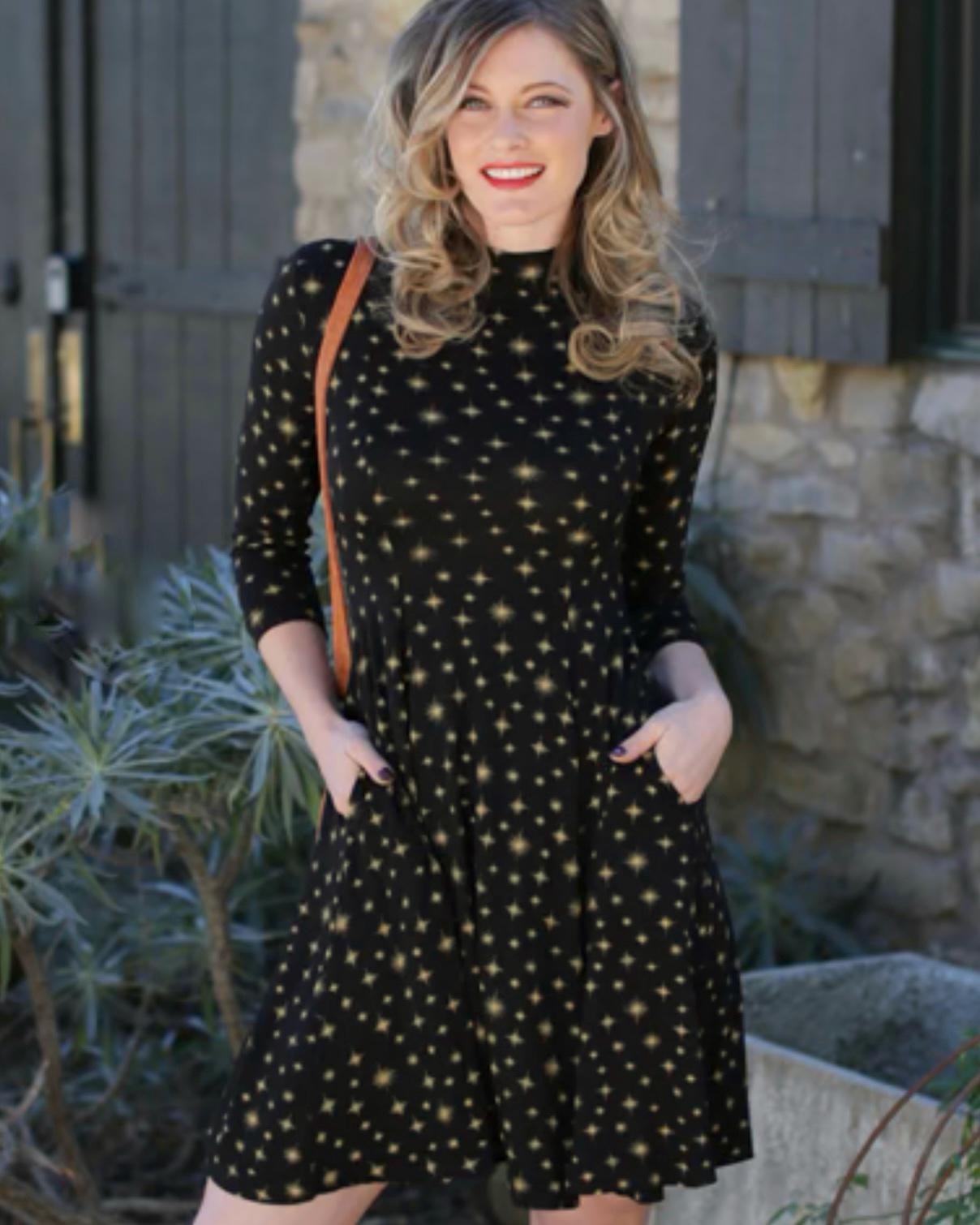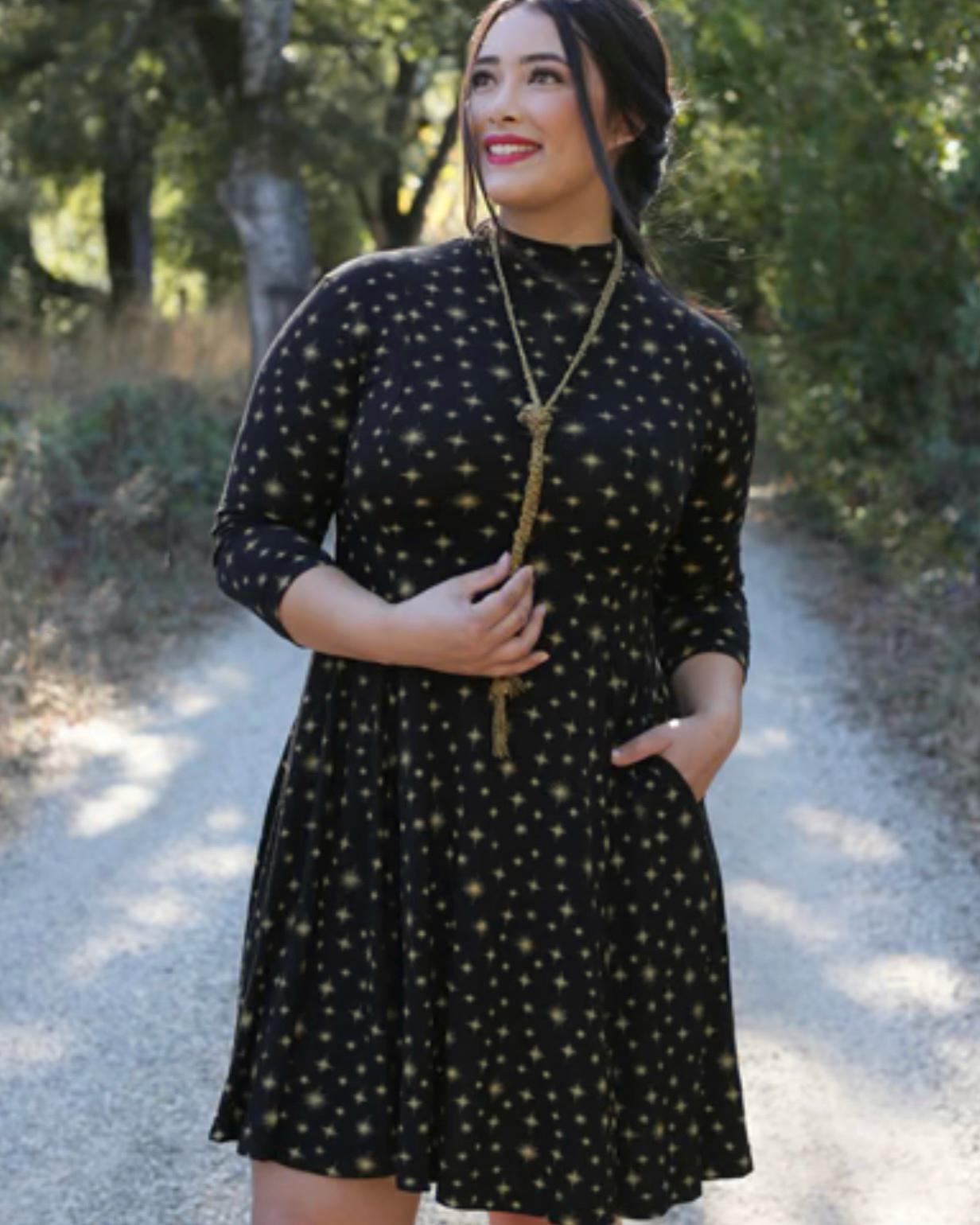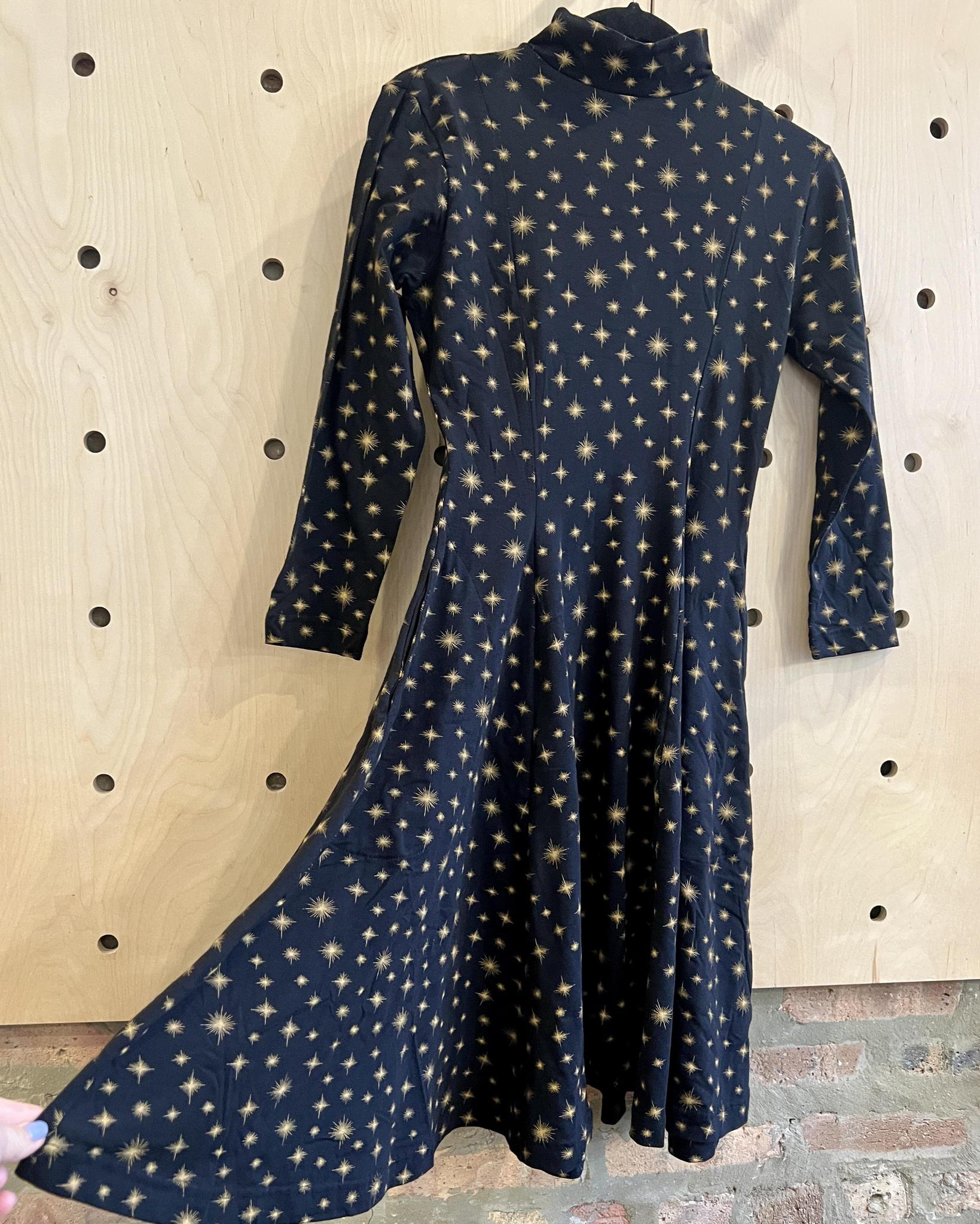 Effie's Heart Mia Dress in Jardinier Print features a high mock-neck neckline, a nipped-in waistline, pockets, and a swingy slightly above-the-knee length skirt. Gold sparkle stars are printed in an allover print on a black background.
