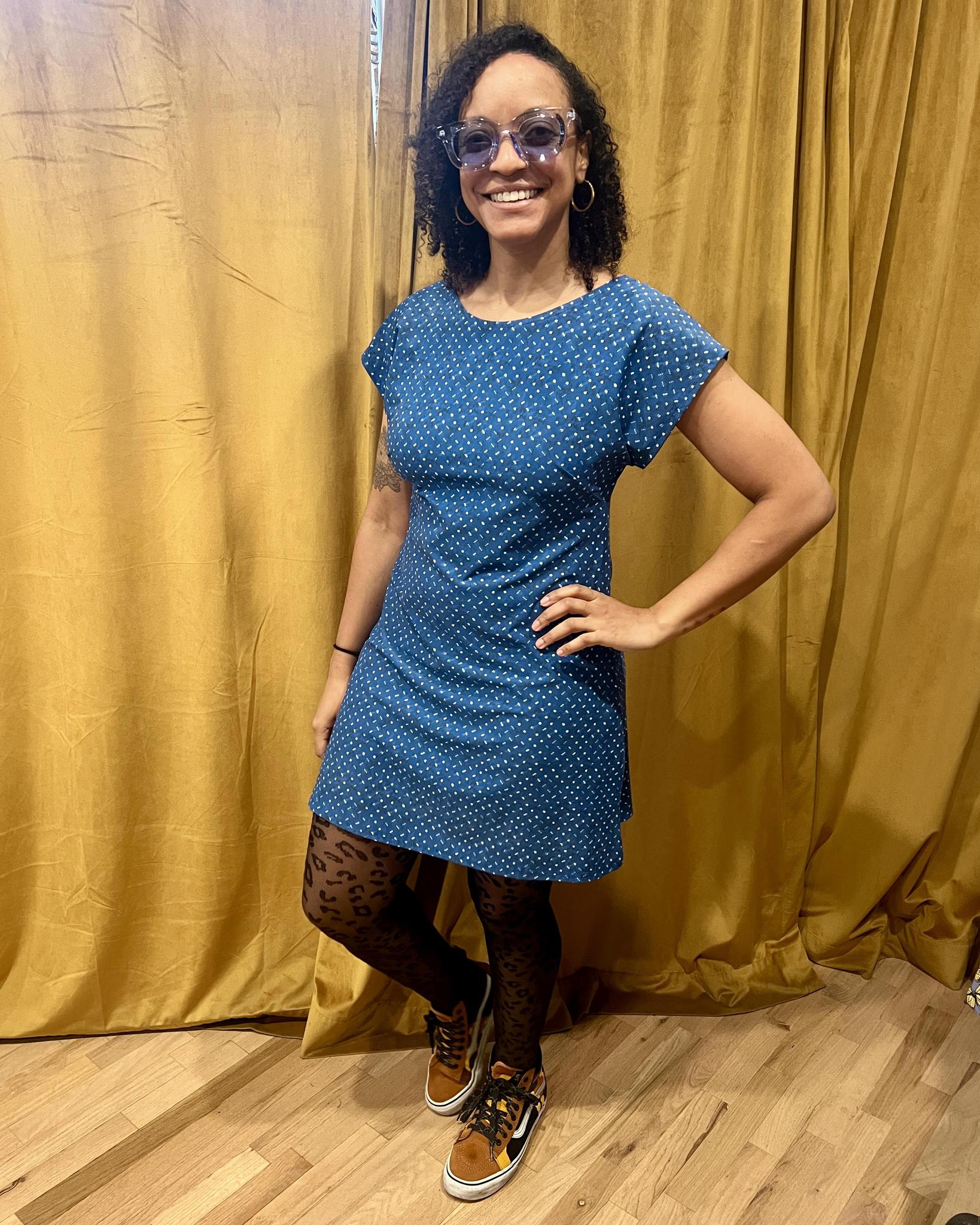 Fayru's new Faye dresses are among Angela's latest designs, an easy crew-neck mini dress with pockets. Beautiful allover white speckly print on a medium blue tone background, simple and adorable.