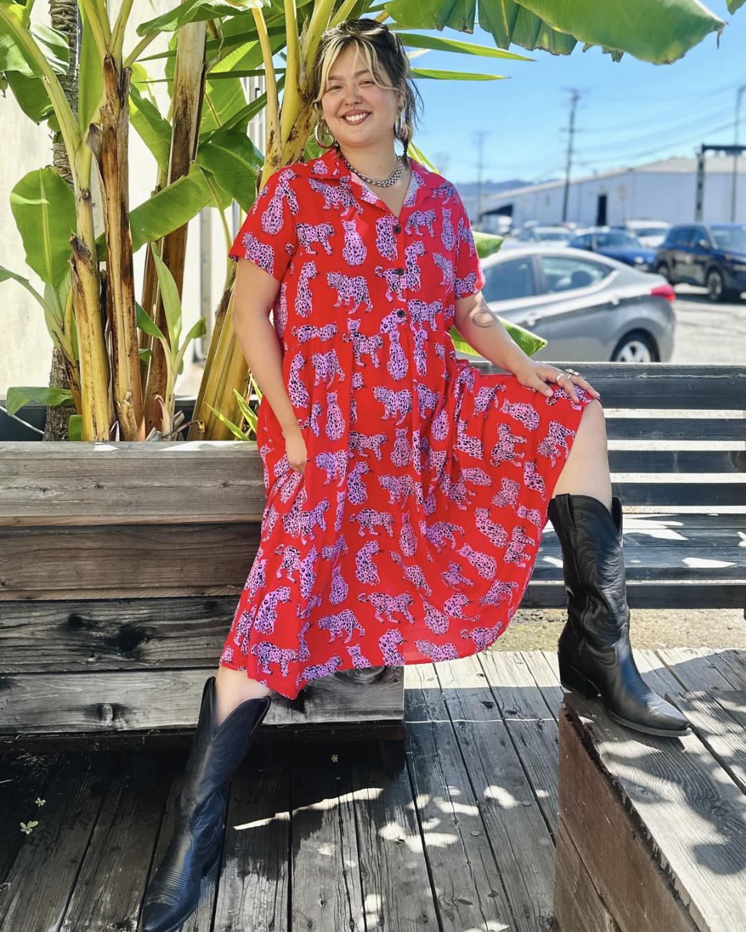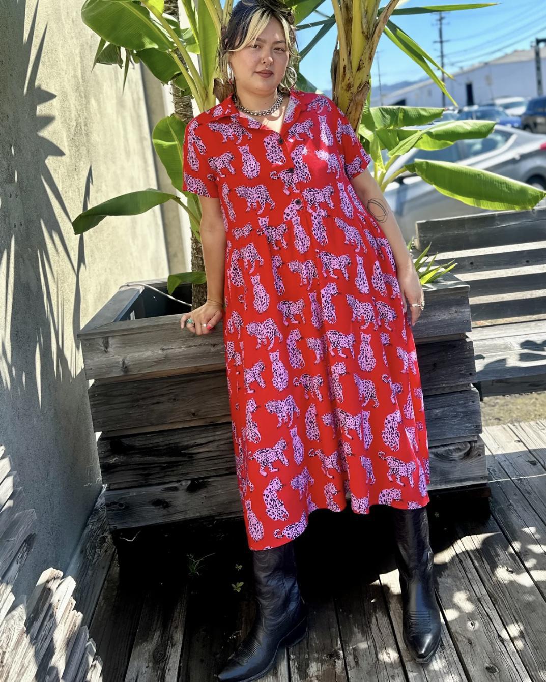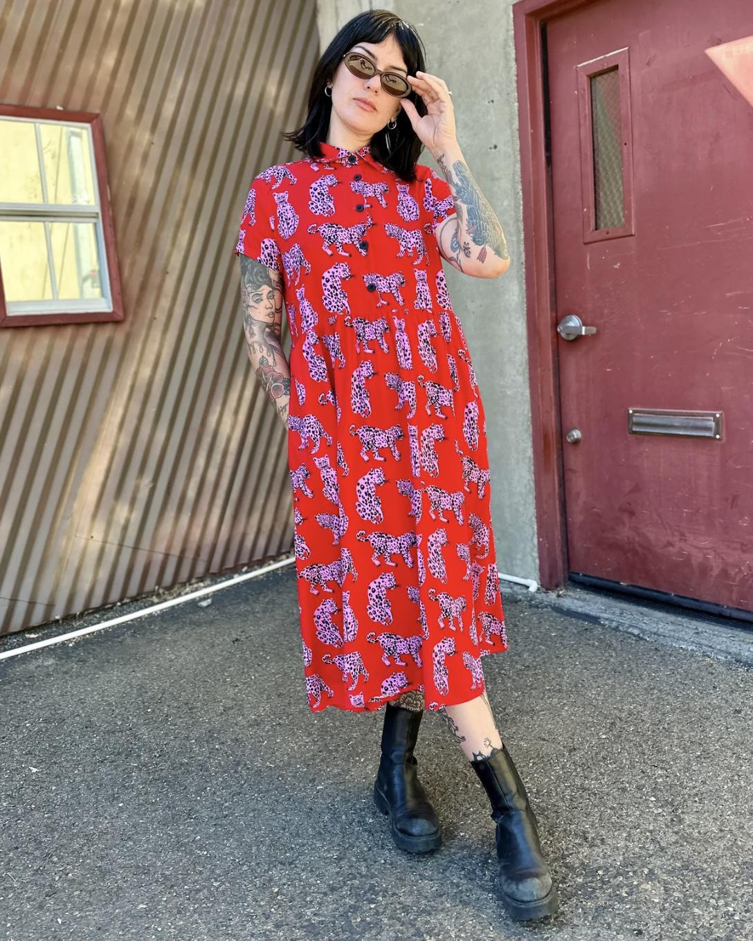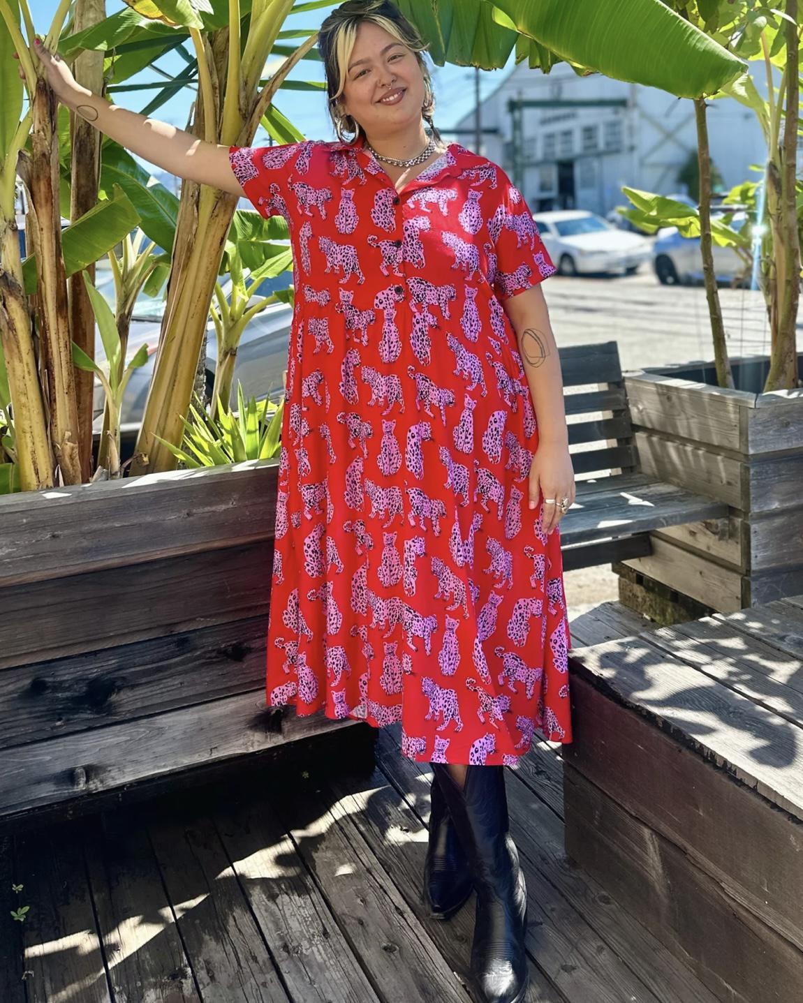 Woah baby! Your new favorite dress is here! This midi-length dress is cut from super soft rayon and features a classic pointed collar and short-sleeves, buttons up the top half of the dress, and a loose and flowy drop-waist skirt. Wear it out to the farmers market for an easy breezy moment or layer it under a track top with popped collar for a seasonal change.