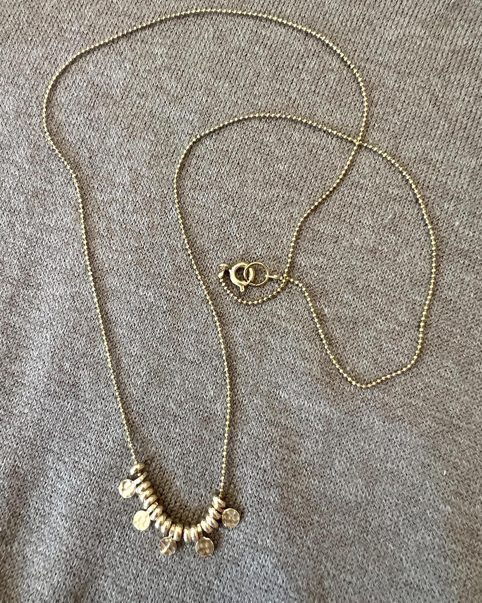 The cutest, most versatile charm necklace there is! Hammered brass disc charms are beaded on faceted brass ball chain along with smooth brass roundelles, making this necklace so easy to layer, with itself or any gemstone necklace.