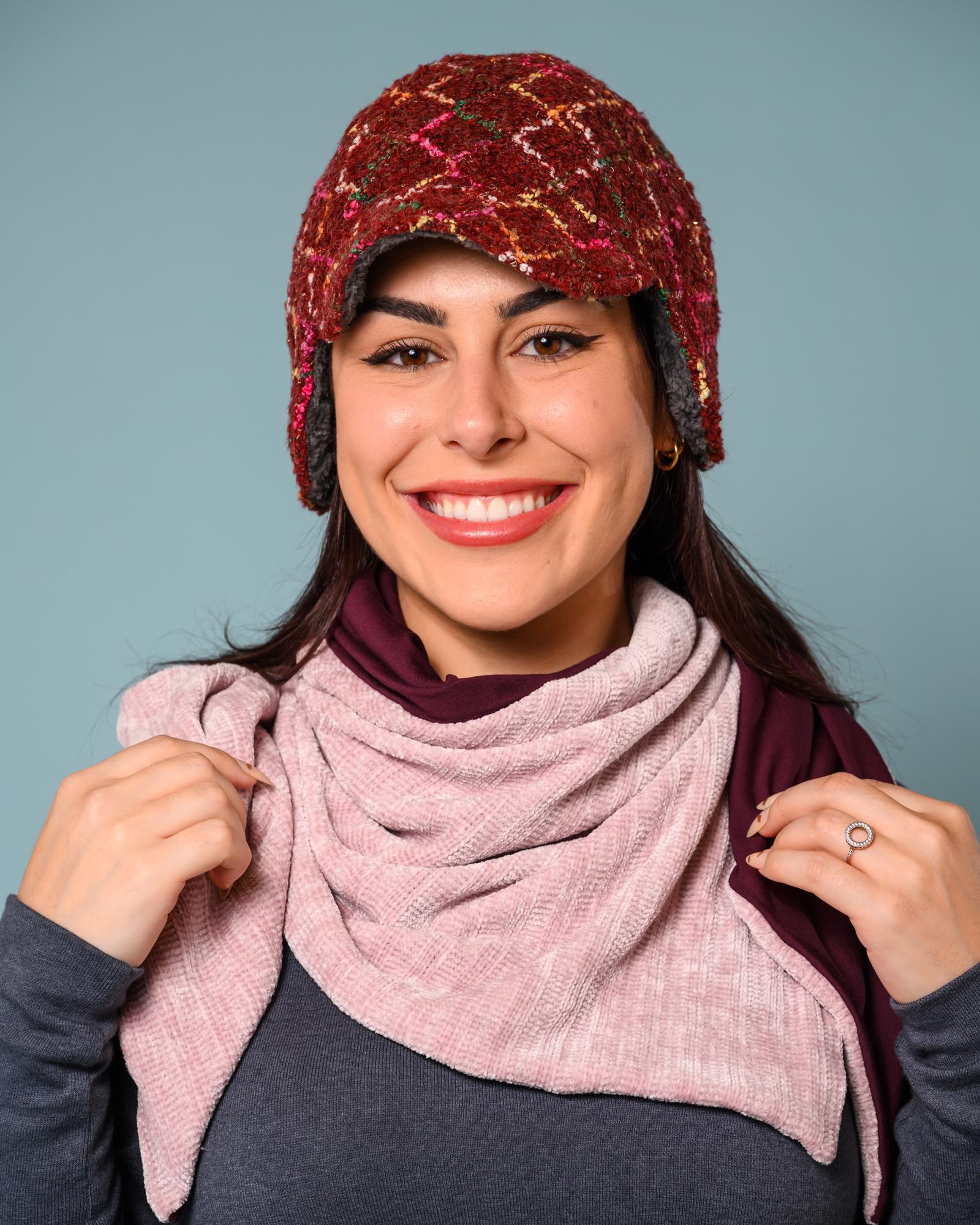 Squasht Darby Earflap Hat in Cranberry Boucle with Squiggly Pattern