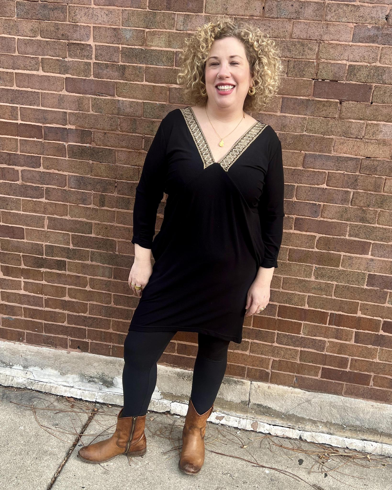 Squasht Drea Draped Dress in Black with Sage & Gold Vintage Trim