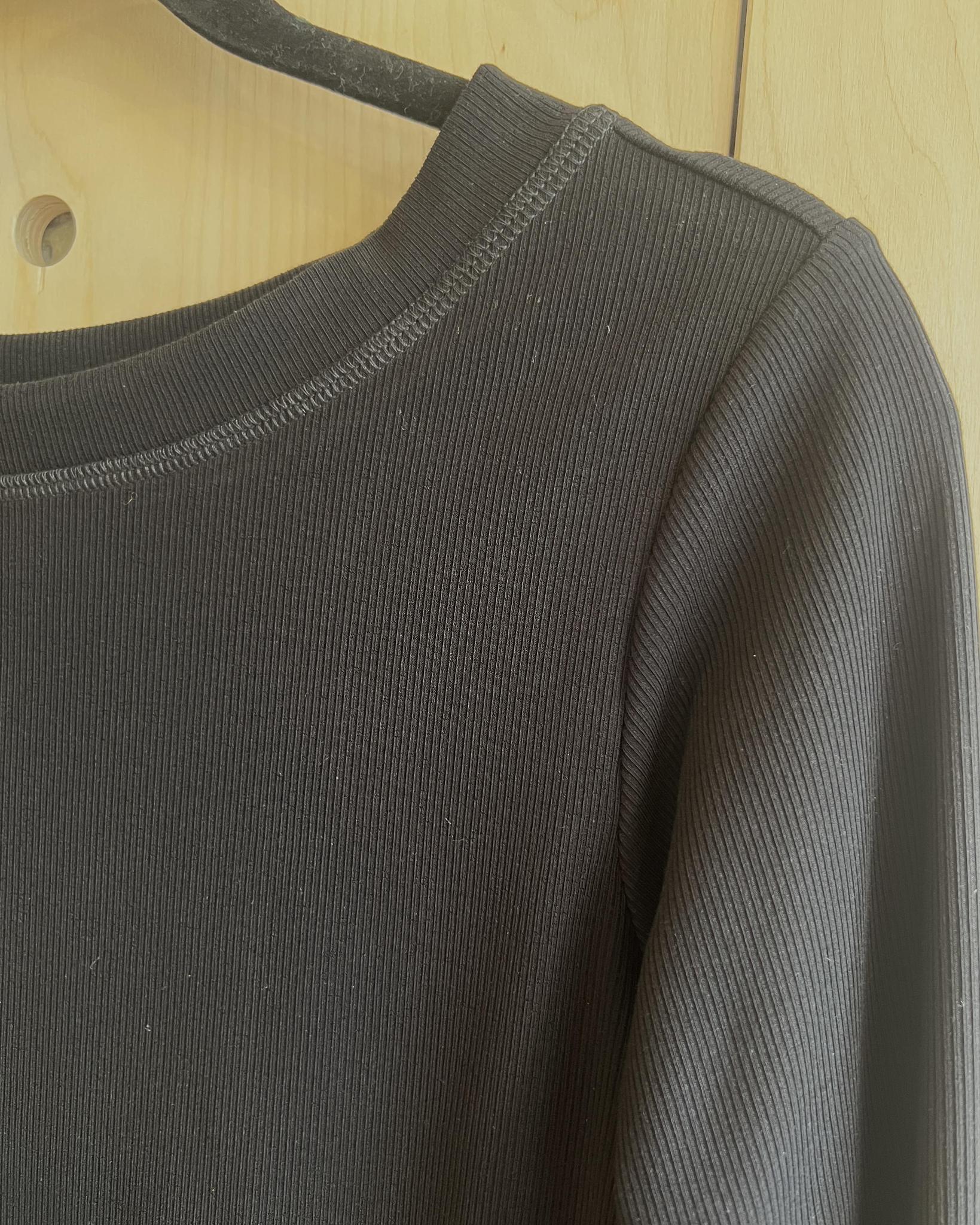 Our newest long-sleeve croppish tee in solid black is made from a super soft and luxurious 1x1 rib knit, featuring a subtle ribbed texture for a flattering fit and finished with matching black neck binding and cuff details.