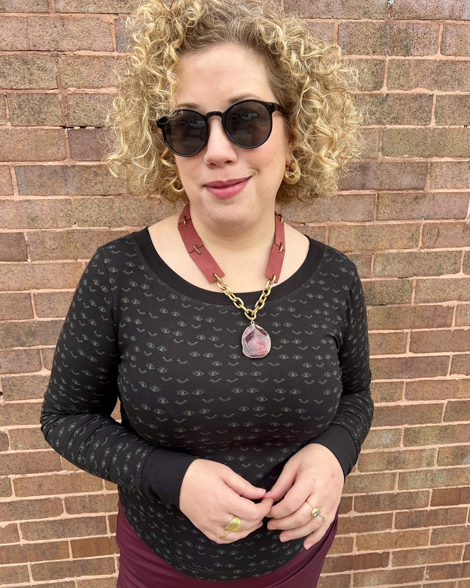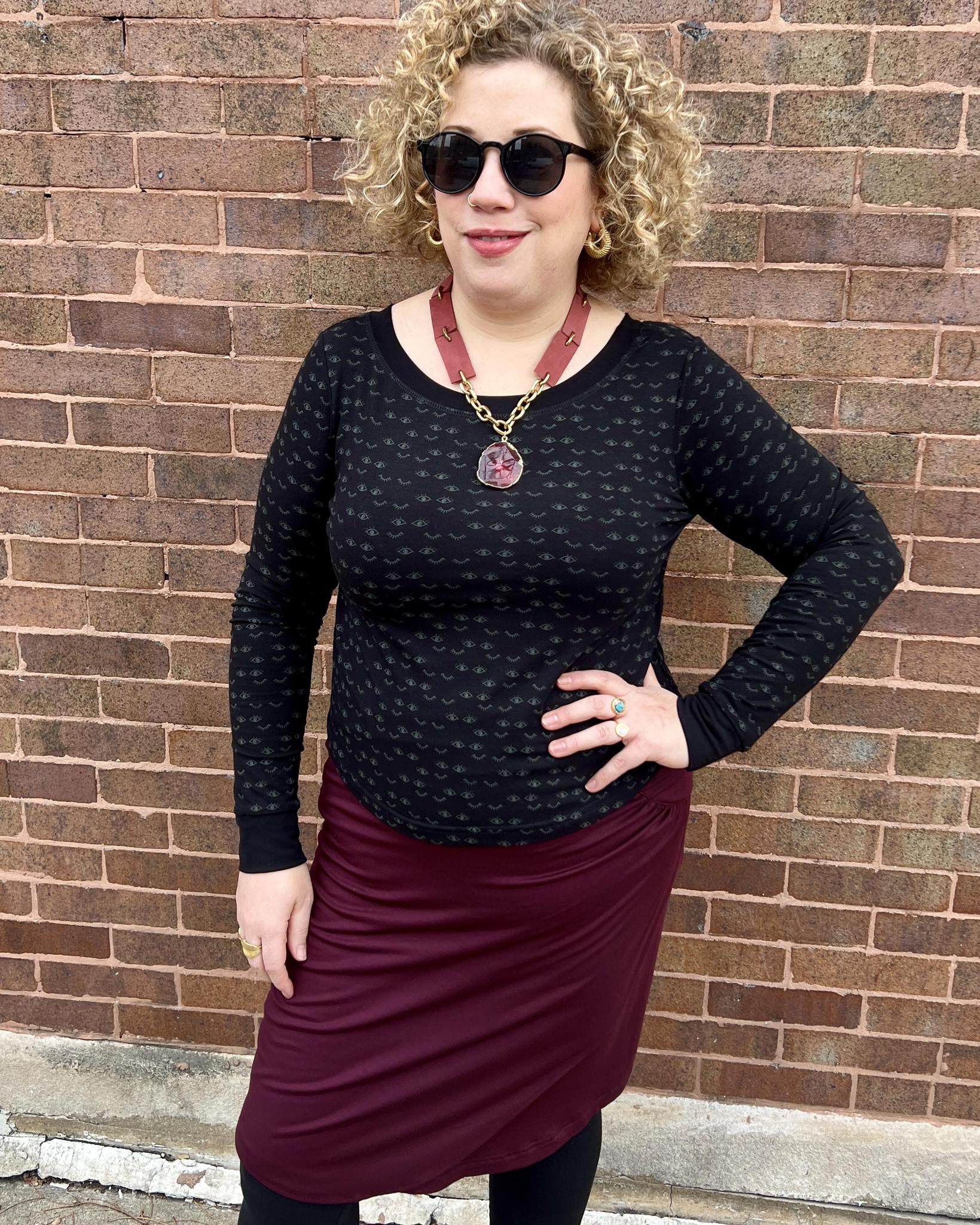 Our newest long-sleeve cropped top in Dreamy Eyes features a mesmerizing allover print of gray eyes—some open, some peacefully closed—on a black background, finished with matching black neck binding and cuffs.