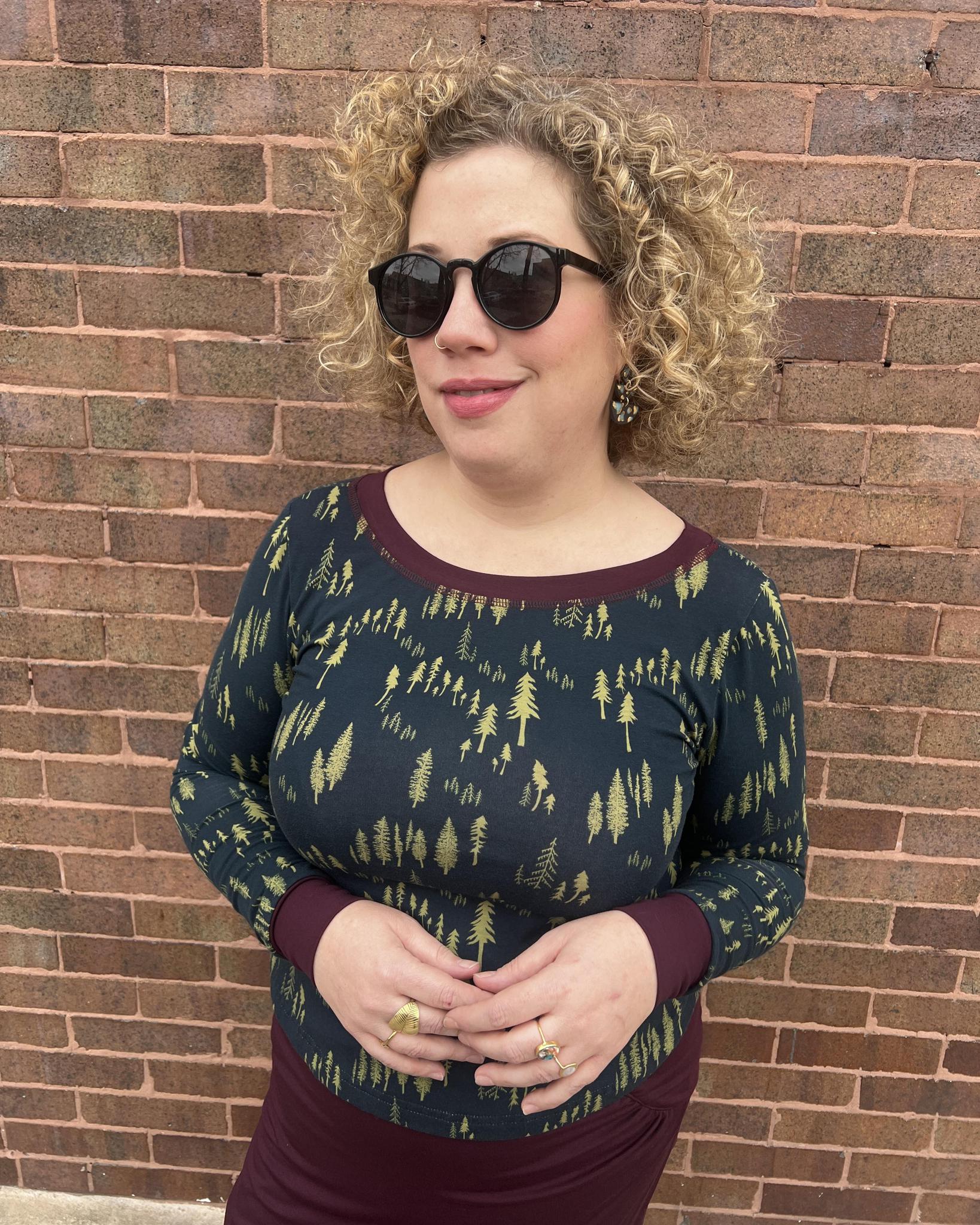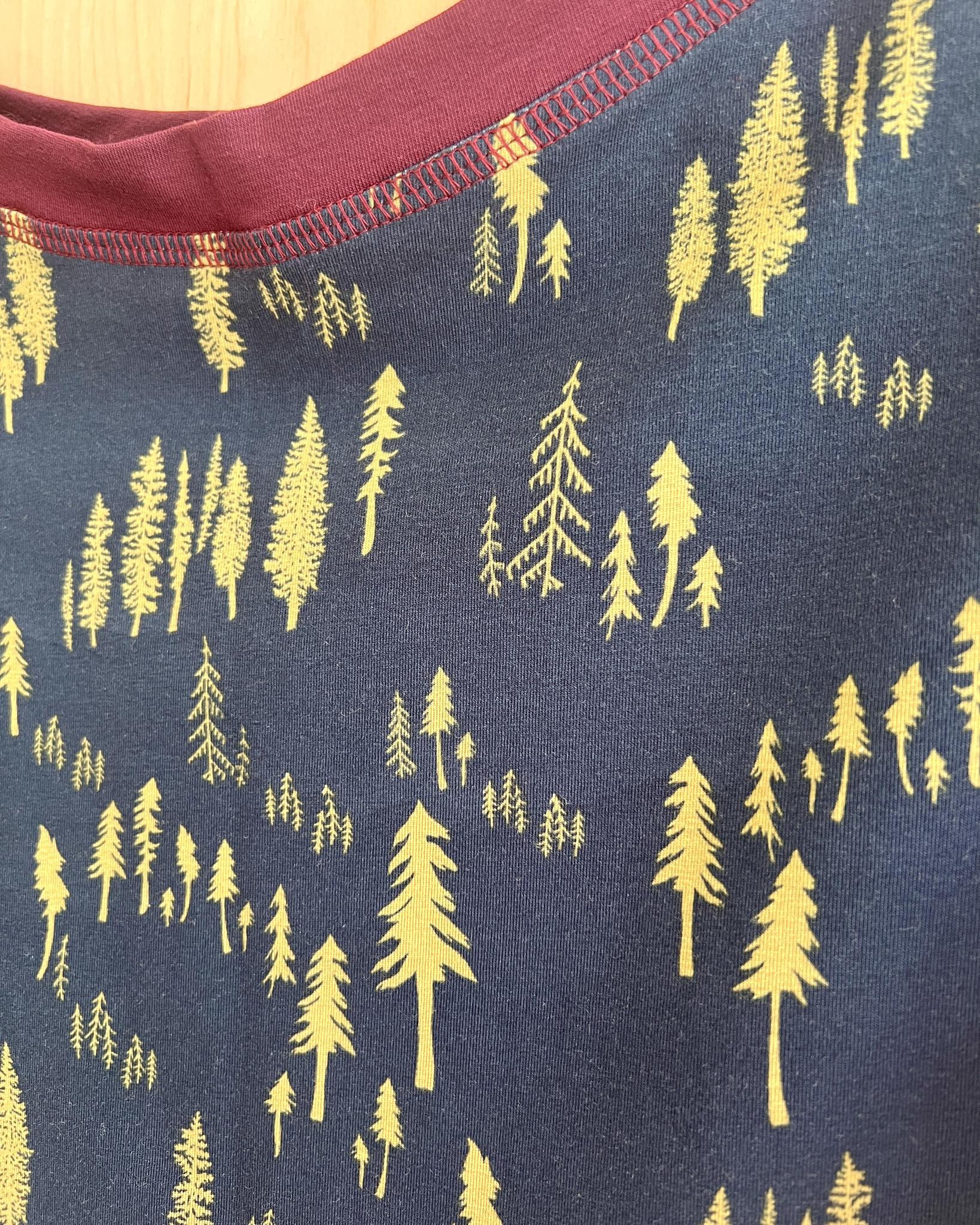 Our newest long-sleeve croppish top in Midnight Forest features a sage green evergreen print set against a deep navy background, finished with contrasting burgundy neck binding and cuffs. The cotton blend material is super soft and luxurious.