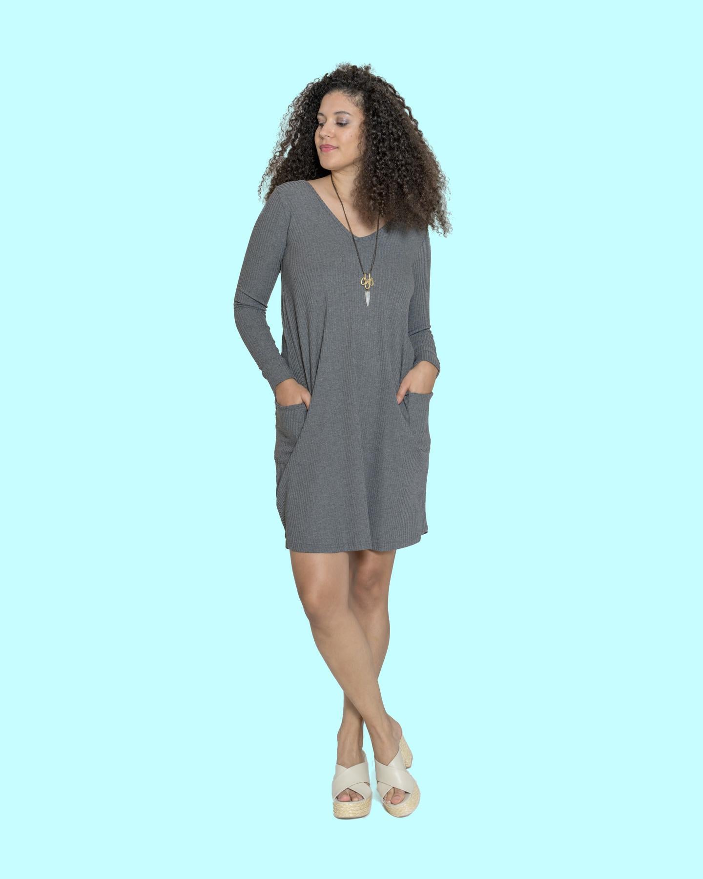 Our long sleeve shift dress will quickly become your favorite easy little gray dress! This high-quality dress is made with soft and flattering heather grey rib knit. This dress is wonderful because it may be worn forward or backward for two different looks, v-neck or scoop neck. Side pockets, cute sleeve cuffs, and a curved hemline finish off this look.