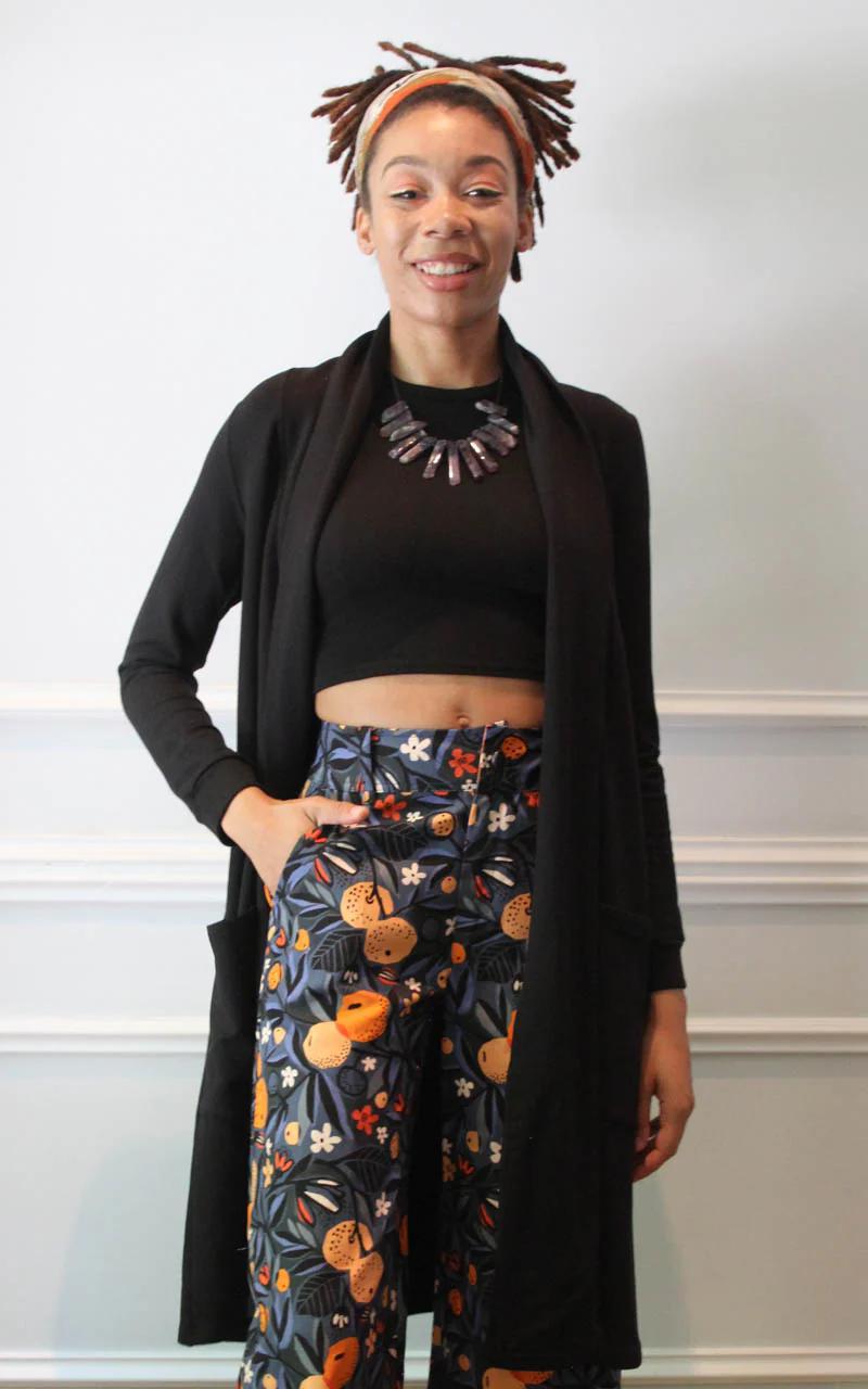 A long cardigan that can be worn as a jacket! Deep pockets, slouchy collar.